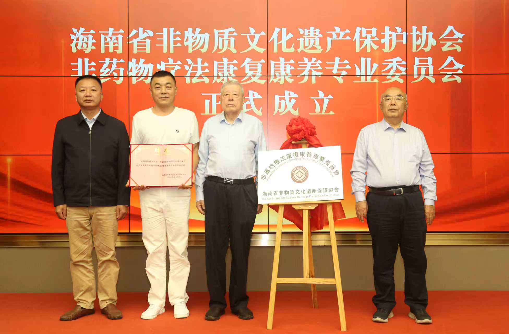 海南省非物质文化遗产保护协会会长敖力勇,国医大师沈宝藩,共同为“海南省非遗协会非药物疗法康复康养专业委员会”揭牌