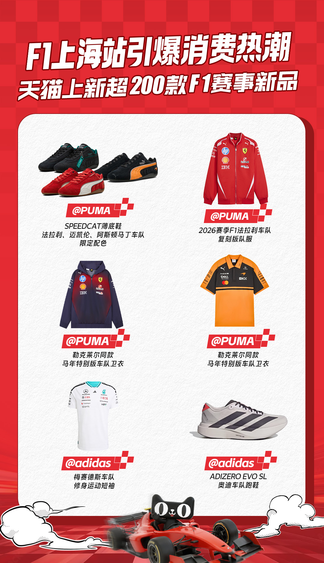 PUMA推出法拉利、阿斯顿马丁、迈凯伦车队限定款SPEEDCAT系列薄底鞋,F1中国大奖赛上海站限定车迷T恤,汉密尔顿、勒克莱尔、阿隆索等明星车手同款系列,全新2026赛季车队复刻版队服。adidas推出梅赛德斯、奥迪车队主题运动上衣、短袖POLO衫、棒球帽、薄底鞋、跑步鞋等系列新品。