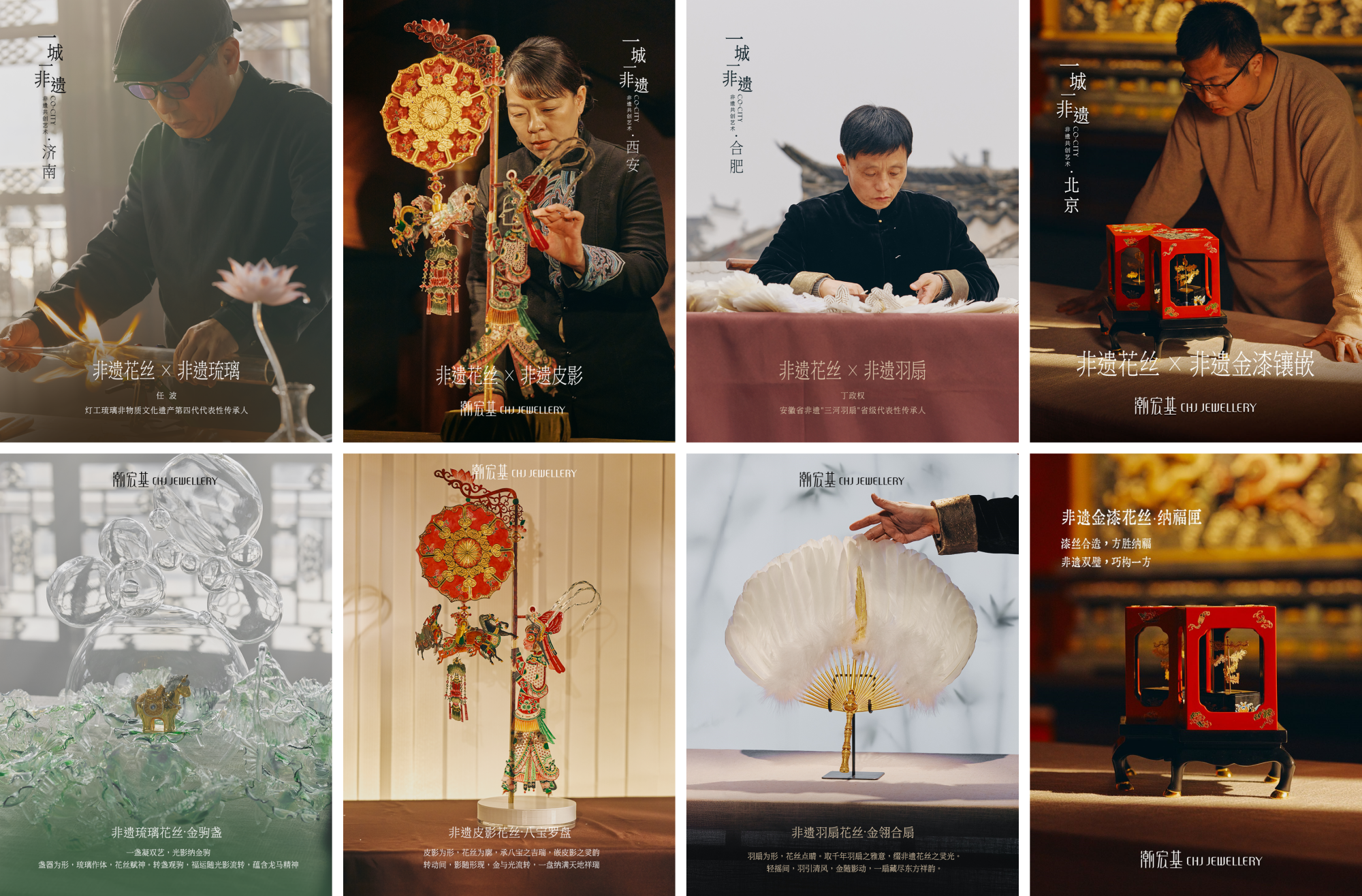 合肥的风雅、西安的热闹、济南的晶莹、北京的华贵、成都的本源——五座城市,五种意境。潮宏基以花丝镶嵌为原点出发,分别与合肥三河羽扇、西安汪氏皮影、山东灯工琉璃、北京金漆镶嵌展开深度共创,国际艺术家杨丹凤作为概念设计师加入,为跨界注入了先锋的审美视野;潮宏基花丝手工坊及潮宏基花丝工艺顾问杜建毅,奠定了花丝技艺的纯粹与高度;四位在地非遗传承人,则让作品真正“长”在了城市的土壤里。每一座城市的非遗,都在反向定义着花丝的无限可能。