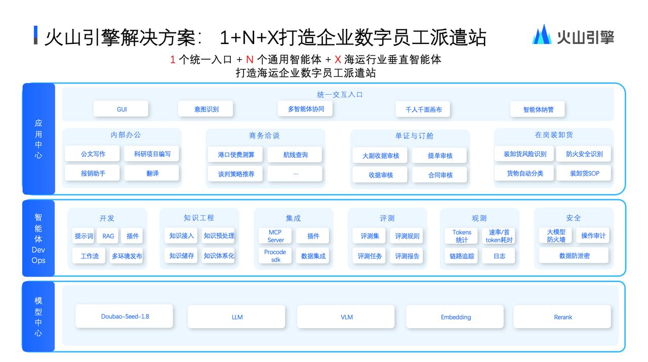 中远海运特运与火山引擎深度合作,基于一站式智能体工作台 HiAgent打造了数字员工派遣站。双方构建了“1+N+X”架构,即:1个统一交互入口+N个通用智能体+X个海运行业垂直智能体。目前,数十个专业智能体已经在单证审核、资信管控、费用测算、风险防范、智能办公等特种运输场景下深度应用。
