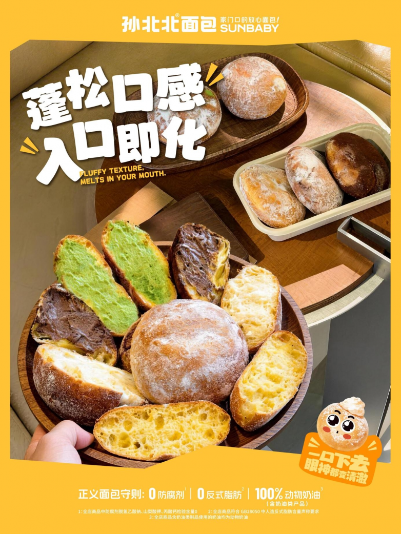 产品创新上,孙北北面包坚守“正义面包守则”核心准则,全线产品承诺0 防腐剂、0 反式脂肪、100%采用动物奶油(含奶油类产品),以健康底线筑牢品牌信任。同时,聘请世界烘焙冠军鲁胚枝大师为首席产品官,全面升级产品口感和品控标准,六大核心品类、百余种 SKU 覆盖全年龄段需求,且坚持亲民定价。记者对比发现,孙北北面包同类产品定价较同类品牌低 20%-30%,亲民的价格让健康烘焙真正走进日常家庭。